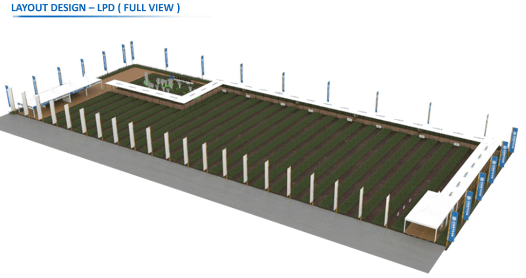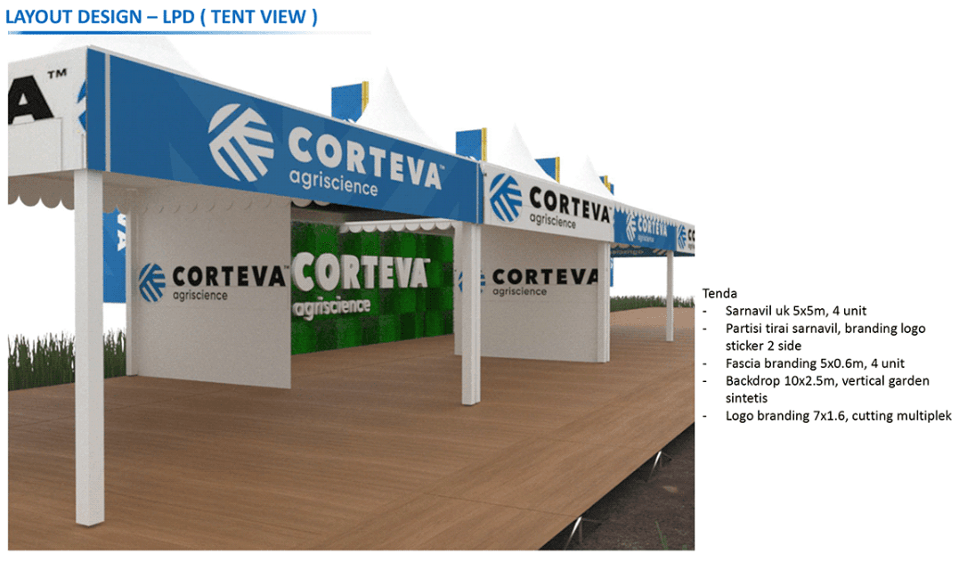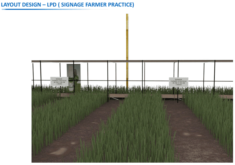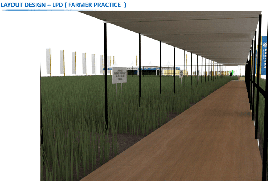 The setup is designed to provide an engaging experience where users walk through the tent while observing the rice fields and gaining valuable information about suitable crop treatments. This approach enhances product knowledge and engagement by directly connecting the information to its real-world application, allowing farmers to see and understand how these products can benefit their crops in their natural environment.