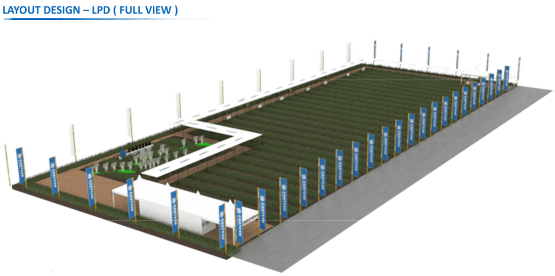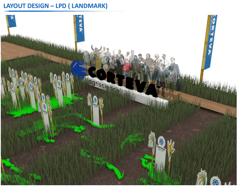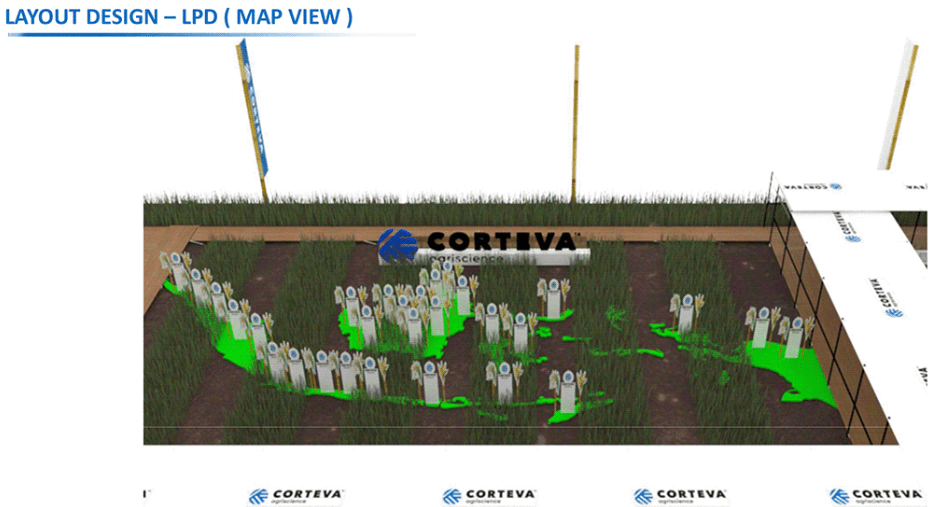 Along the journey from start to finish, both farmers and company representatives are presented with a series of product totems showcasing Corteva's innovations. These totems feature various plant care products alongside the types of crops they are best suited for, detailed benefits of each product for specific plants, and banners highlighting local farmer communities.