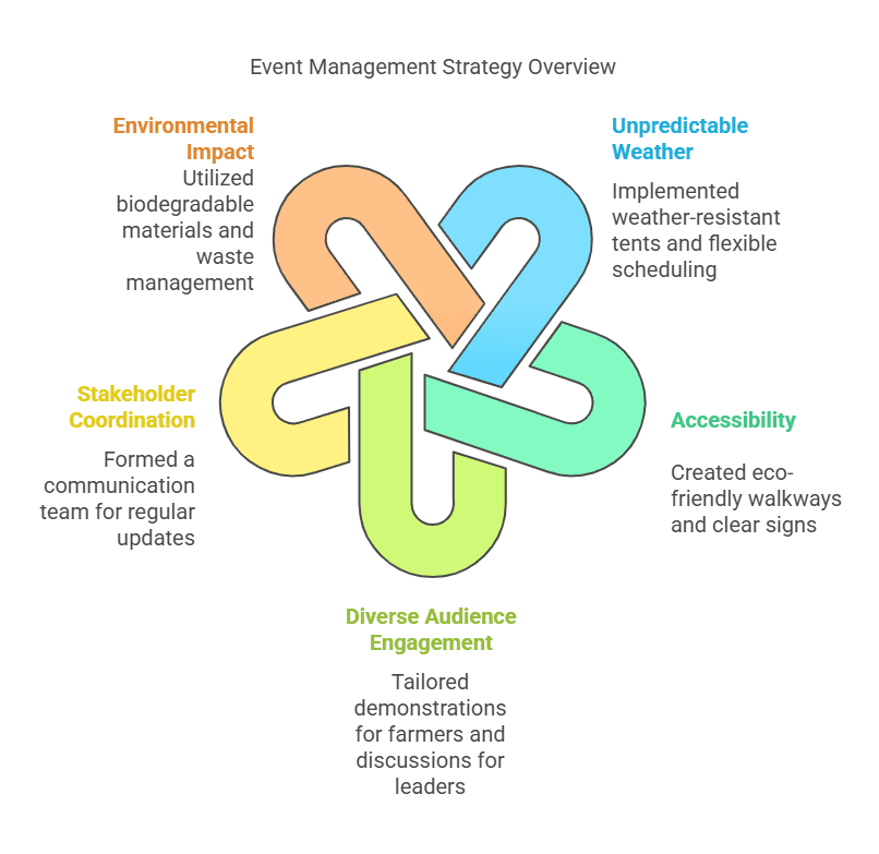 Second, event setup must consider infrastructure like paths, seating, and presentation areas suited to the rice field environment, along with contingency plans for weather conditions such as rain, temperature, and humidity.