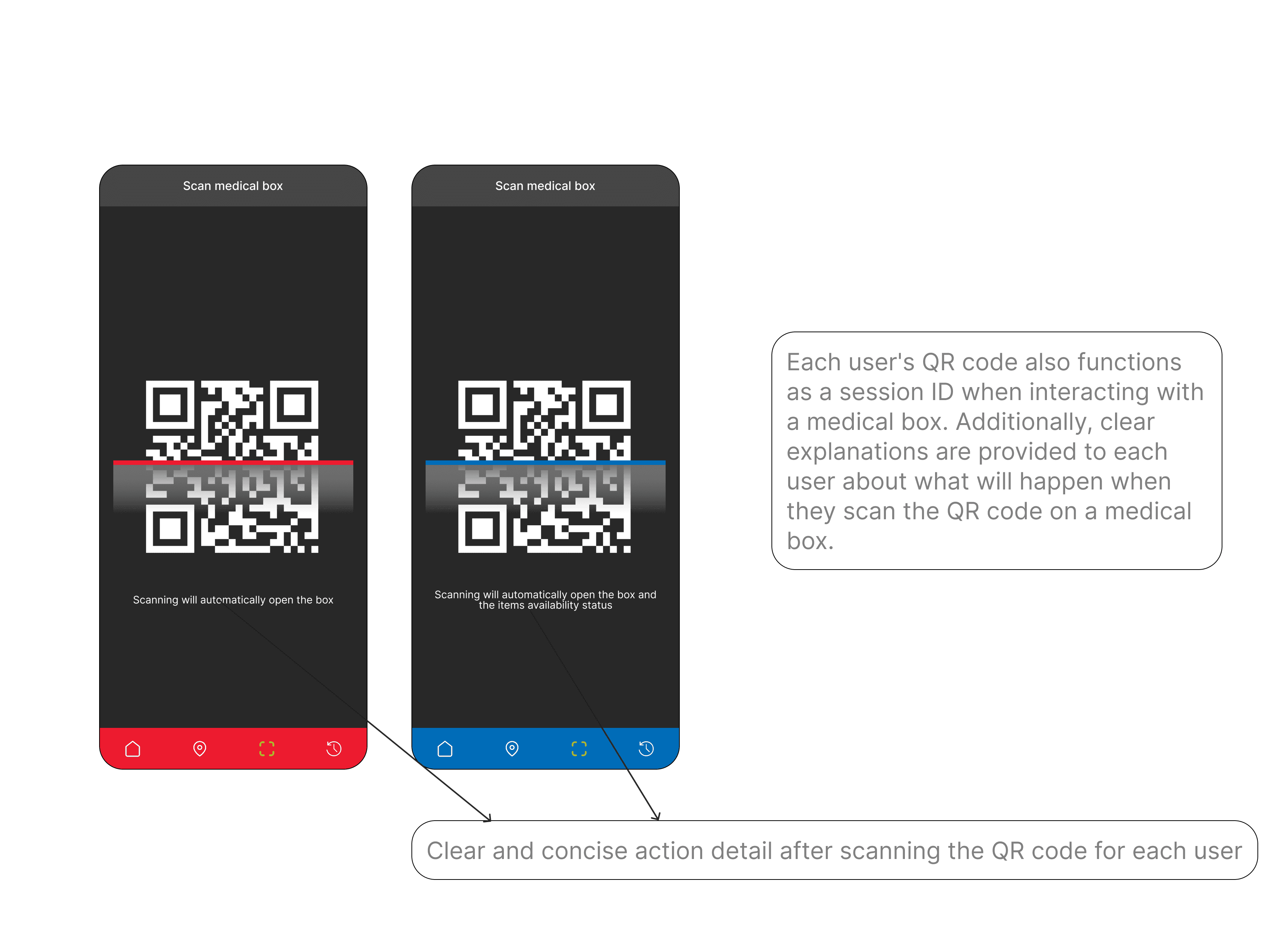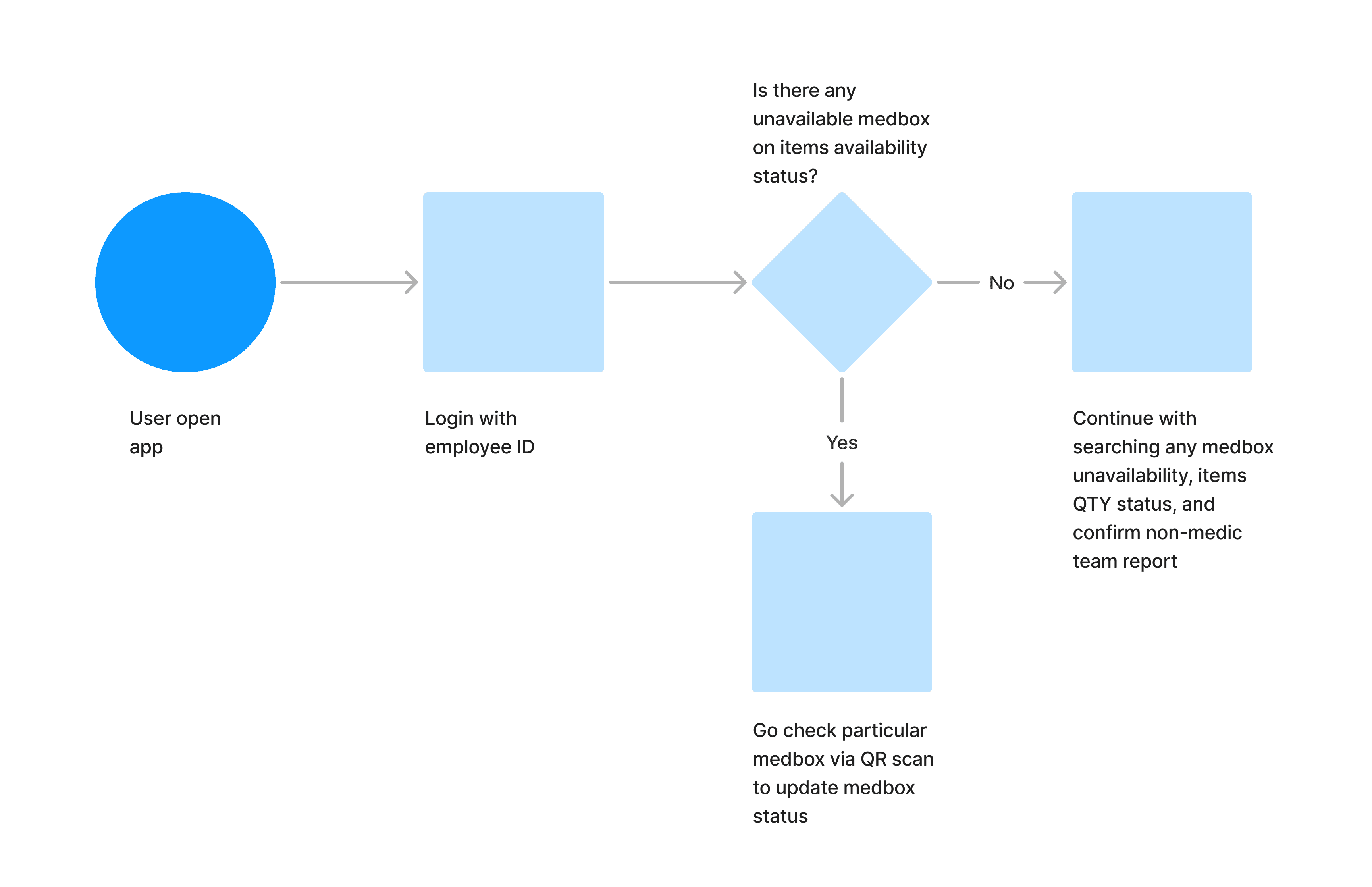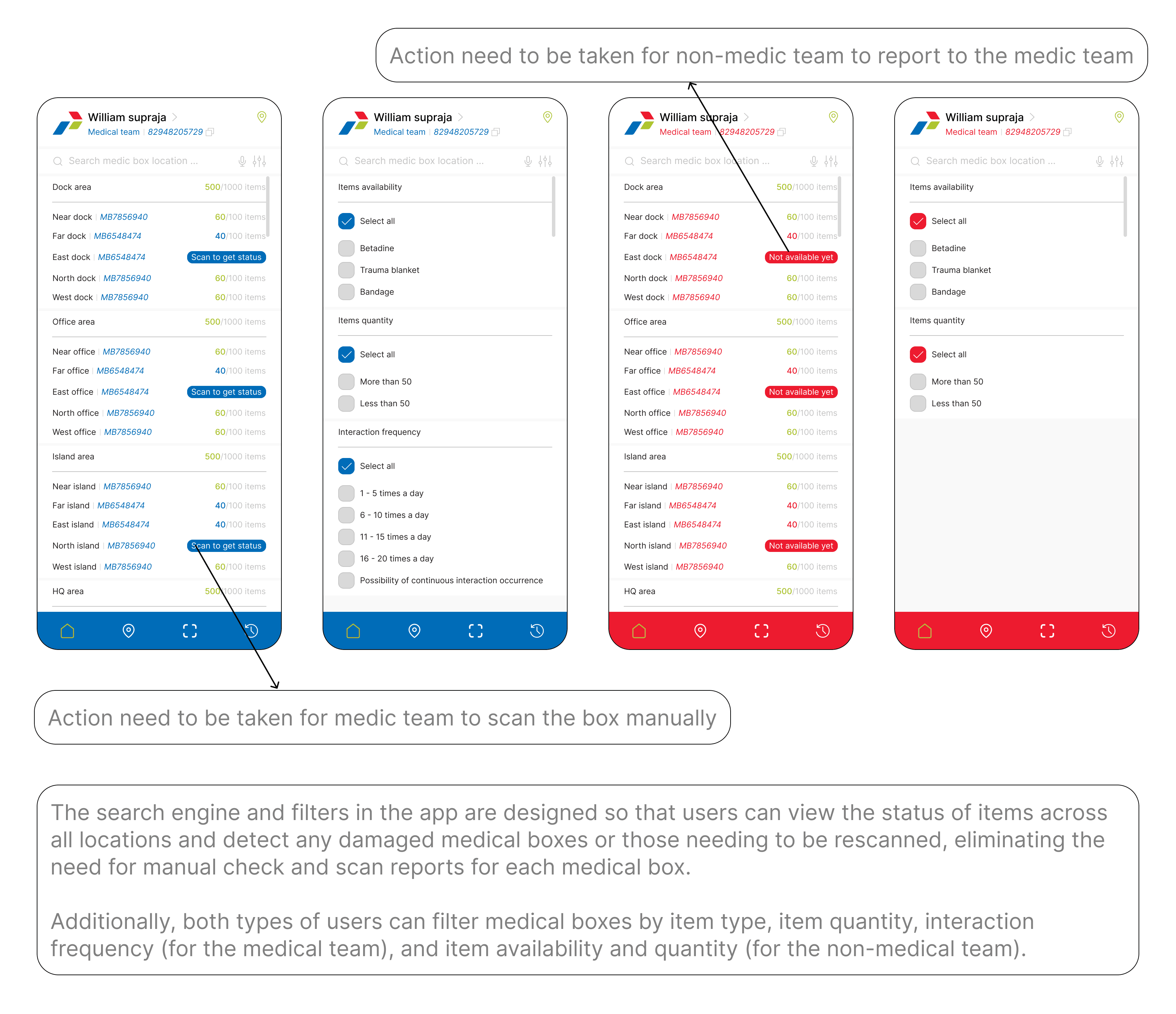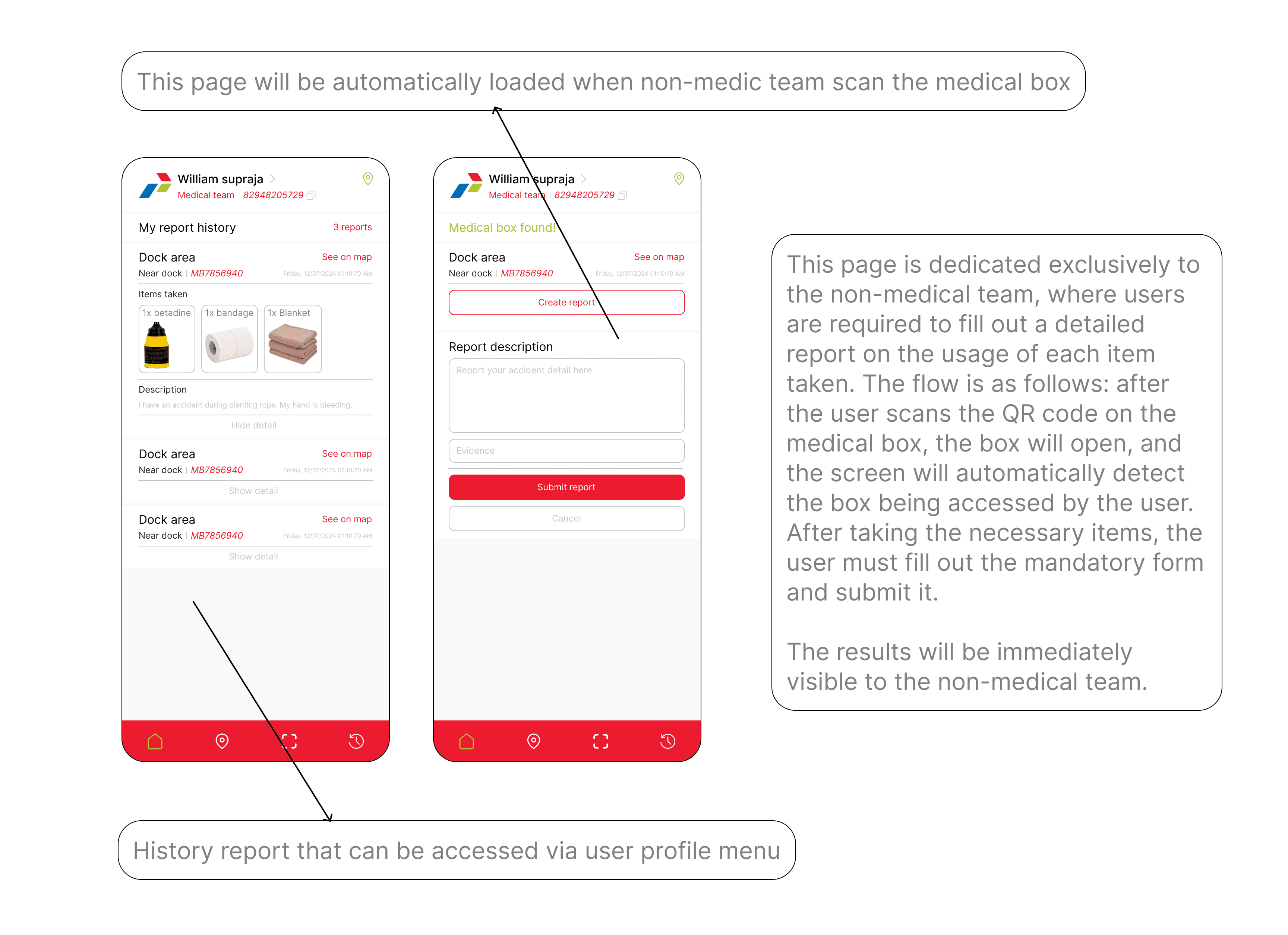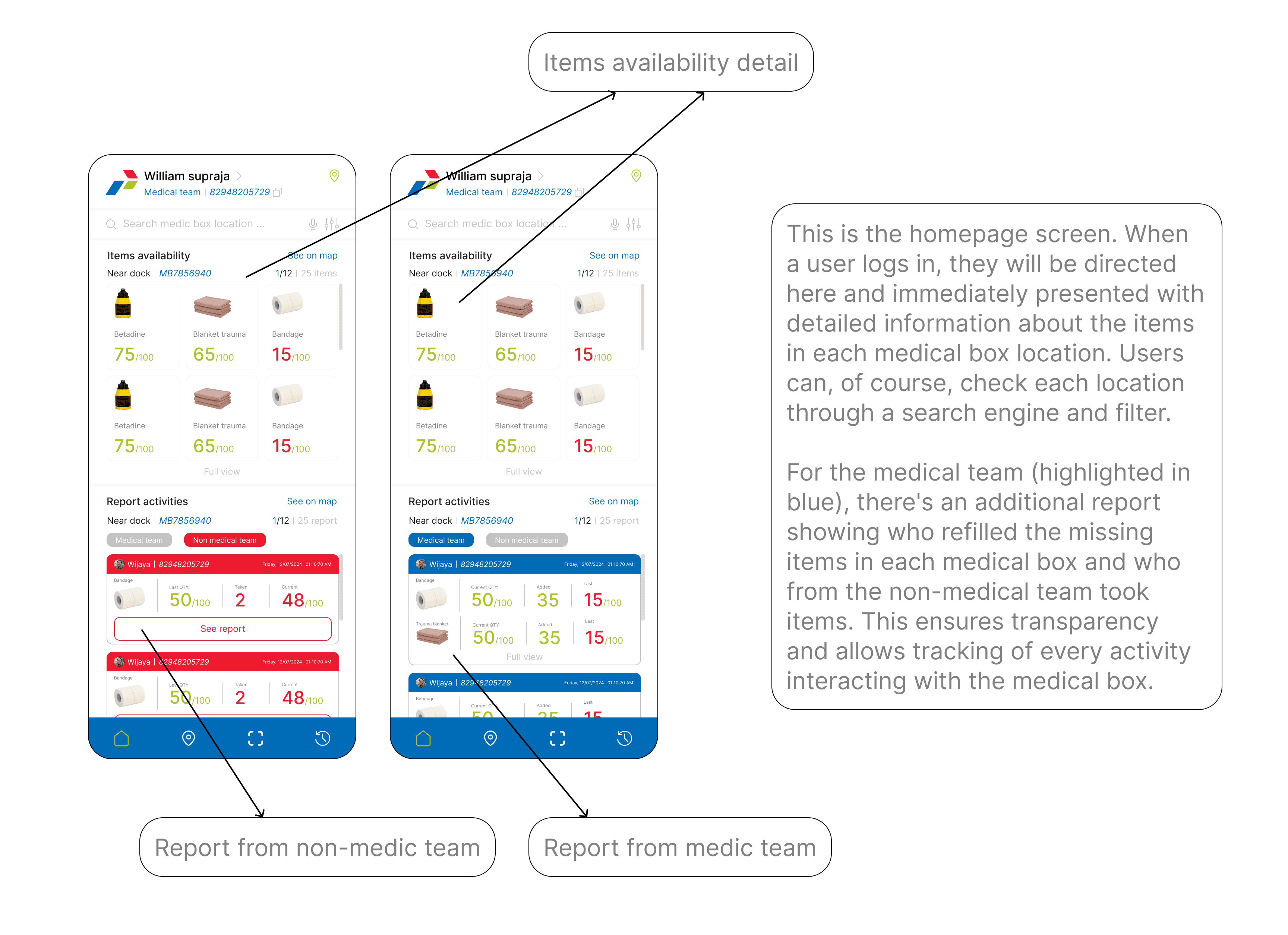 I developed a user flow divided into two paths: one for the medical team and one for field workers. For the medical team, their primary task is to audit medical boxes daily. With the mobile app, they no longer need to manually check each item. Instead, they can scan an area to assess the inventory of all medical boxes. If any boxes are found to be lacking items, the medical team can refill them as needed.