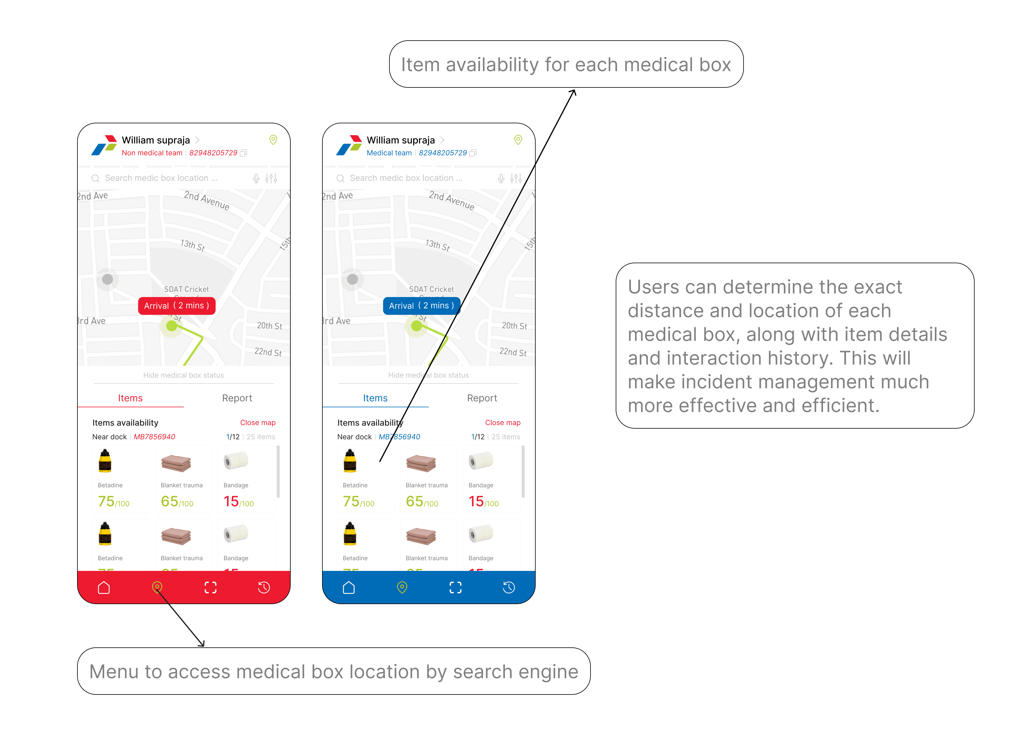 For the field team, in the event of a workplace accident, they or their colleagues can locate a medical box using the mobile app. They can search an area, scan detailed locations of medical boxes, or filter for specific items to find which medical box has them. Additionally, the field team can report depleted medical boxes to the medical team for restocking.