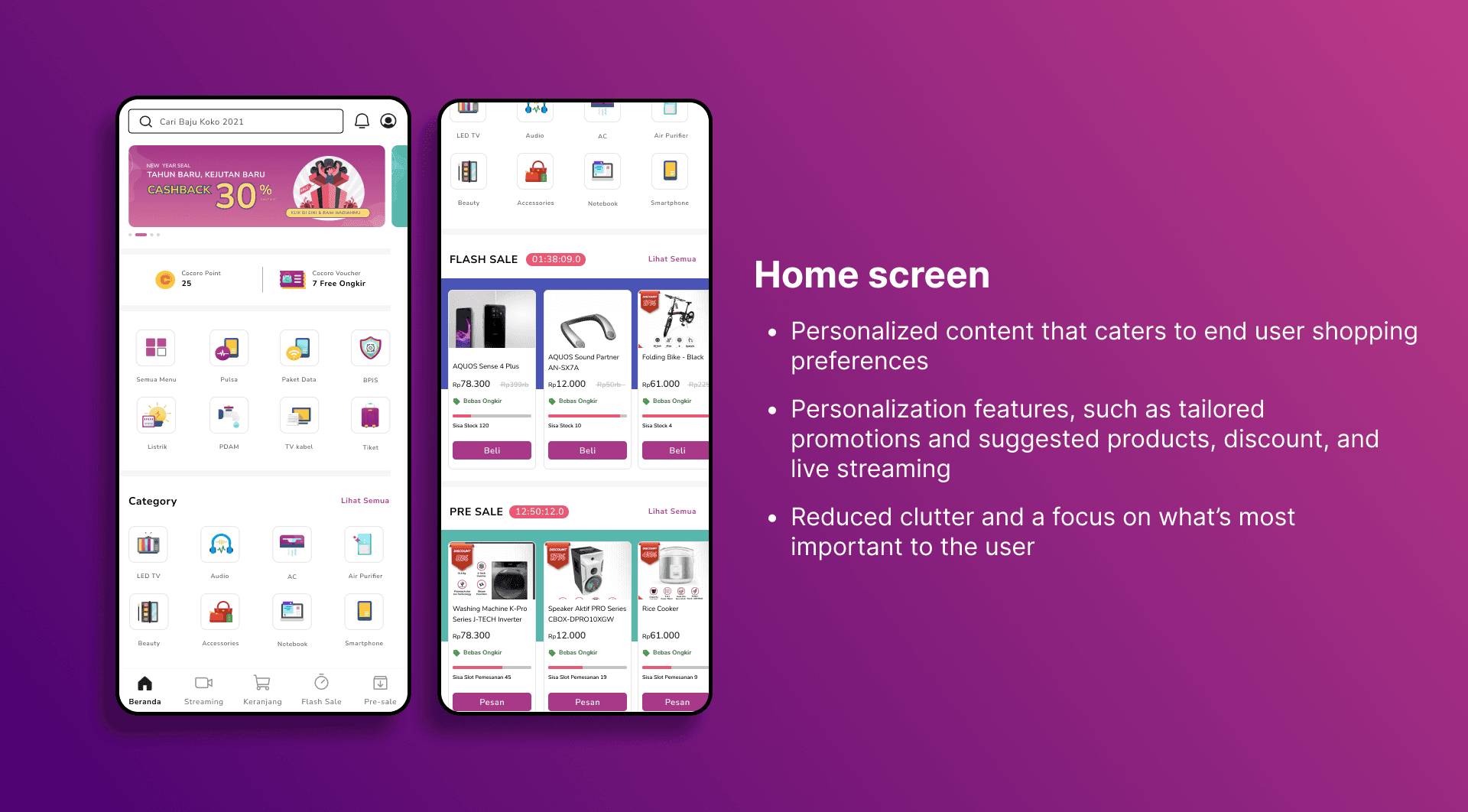 Cocorolife has successfully positioned itself as a strong alternative in the competitive e-commerce market by focusing on high-quality electronics, differentiating from competitors like Shopee and Tokopedia. The platform features a user-centric, minimalist design that enhances usability and reduces cognitive load. By integrating trusted third-party vendors, Cocorolife expands its product catalog and builds brand trust through verified stores. Flexible payment options, support for SMEs, and efficient logistics further improve user satisfaction and foster community growth. Personalized recommendations, filters, and a streamlined checkout process enhance engagement and retention, ensuring a seamless shopping experience.