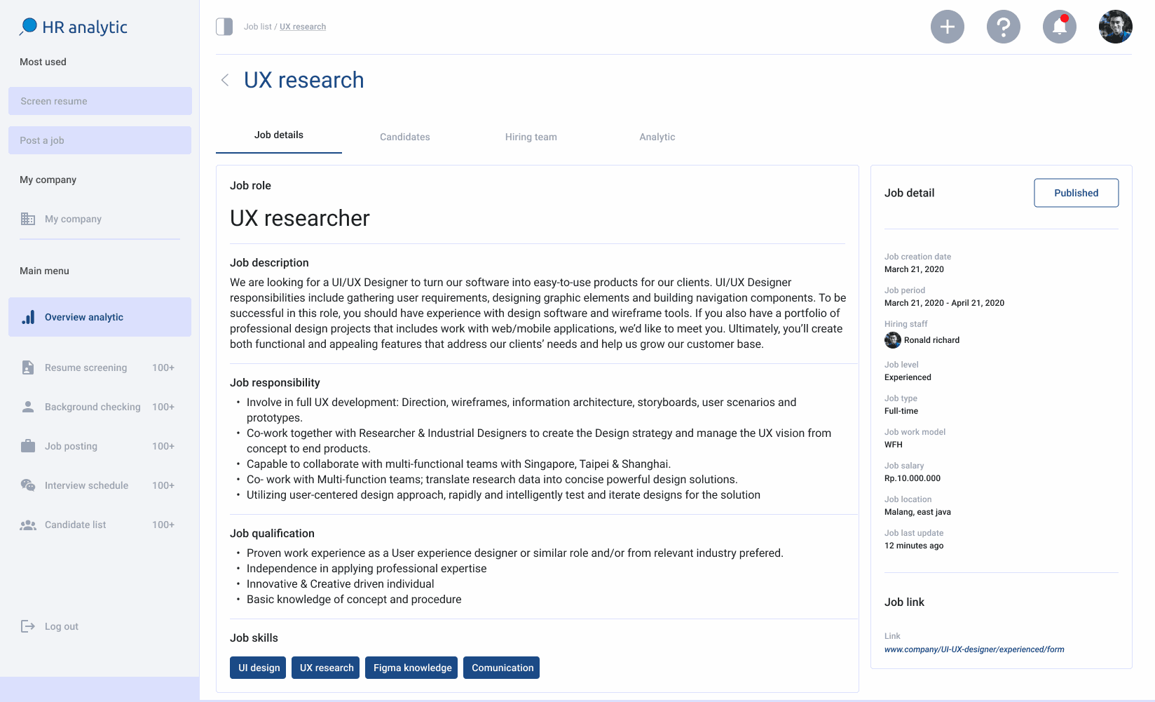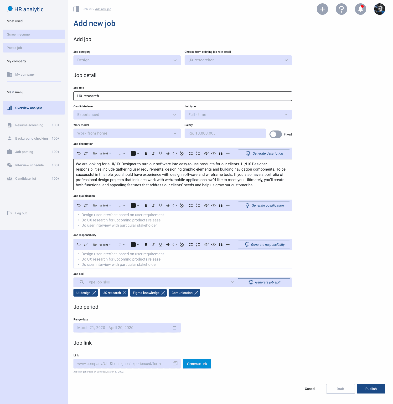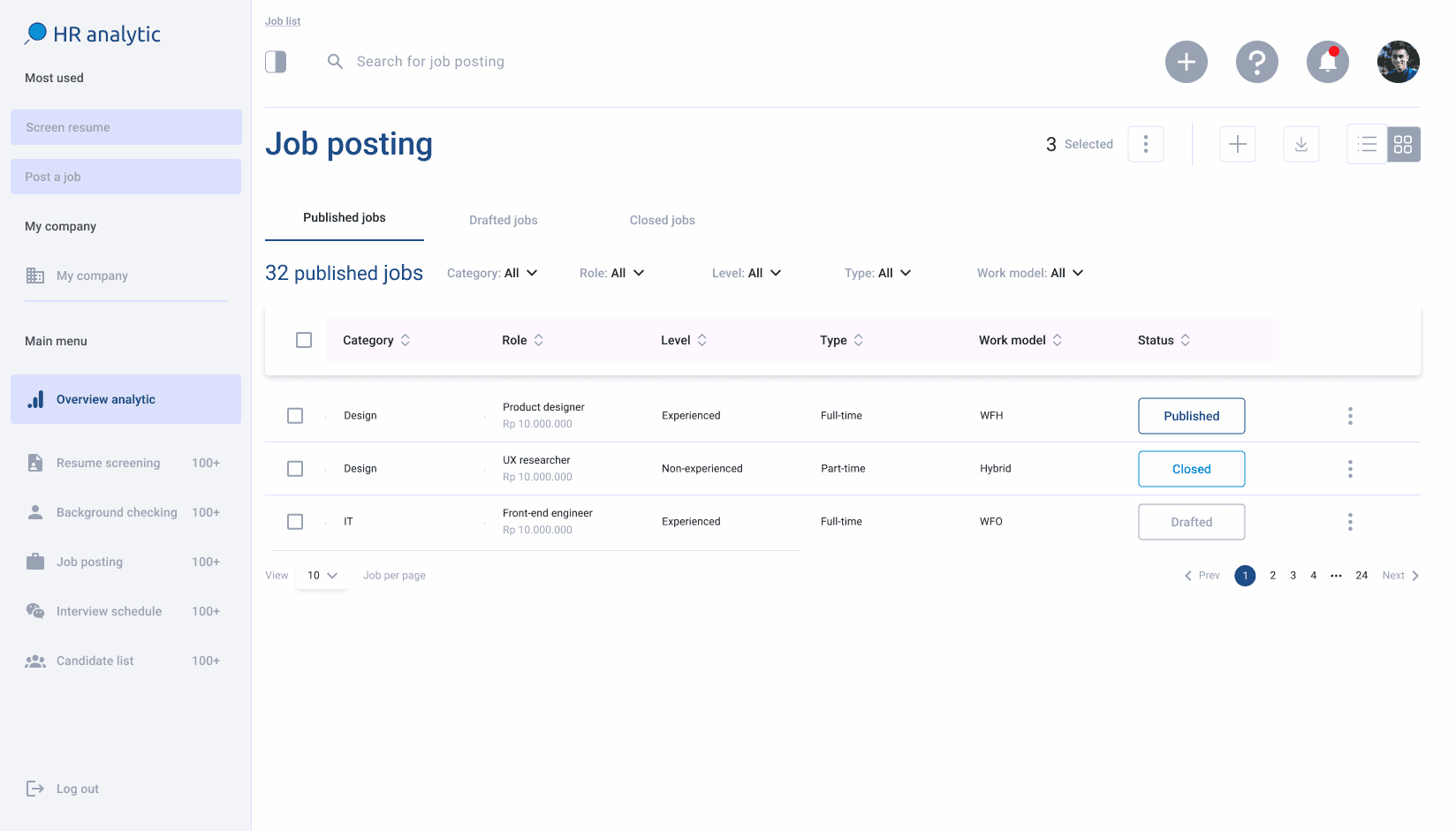Job posting includes a list of jobs that have been created along with basic CRUD operations for jobs, and categorizes them into published, drafted, and closed jobs. 'Published' means the job is live and visible to applicants, 'Drafted' means the job has been created but is not yet visible to applicants, and 'Closed' means the job is either closed or has already received suitable applicants.