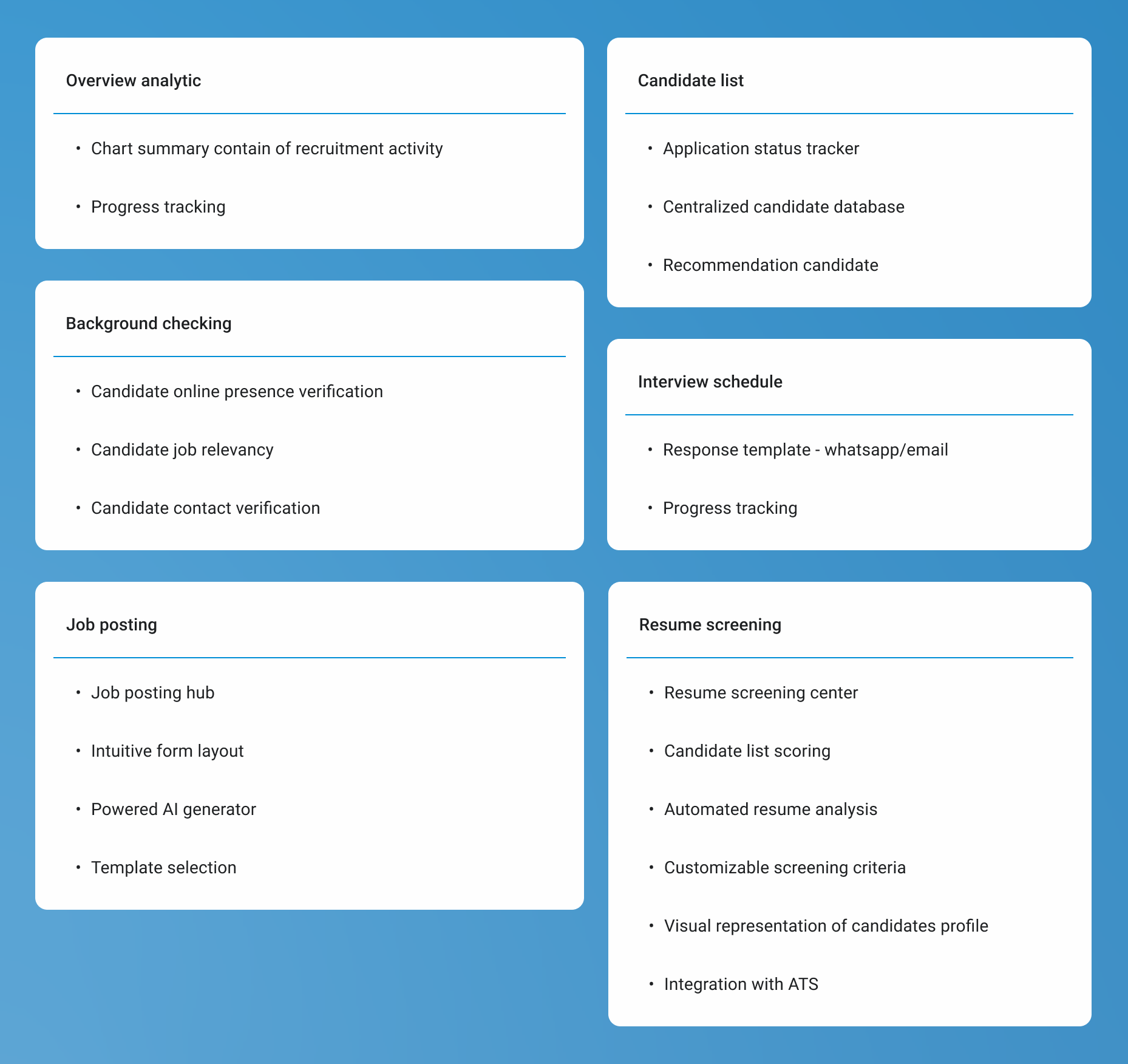 Our SaaS HRD dashboard is equipped with a robust set of features designed to tackle the challenges faced by HR professionals in todayβs competitive recruitment landscape: