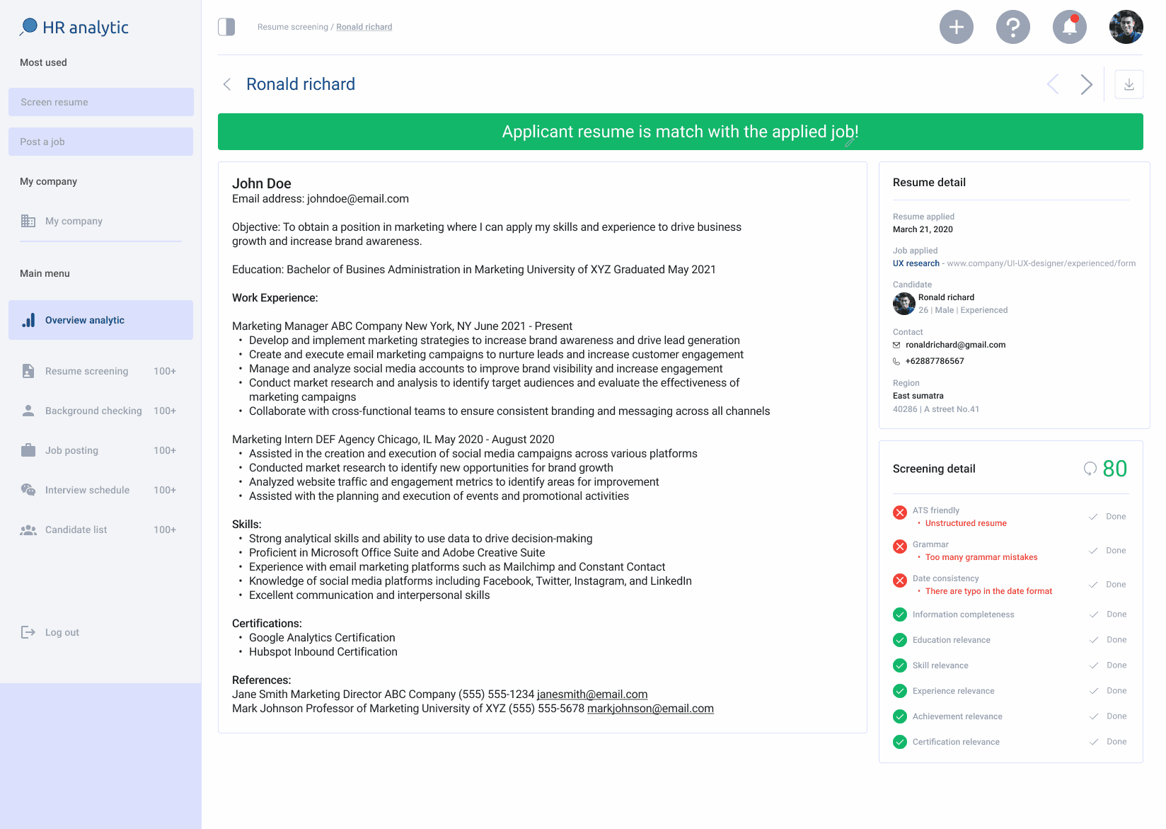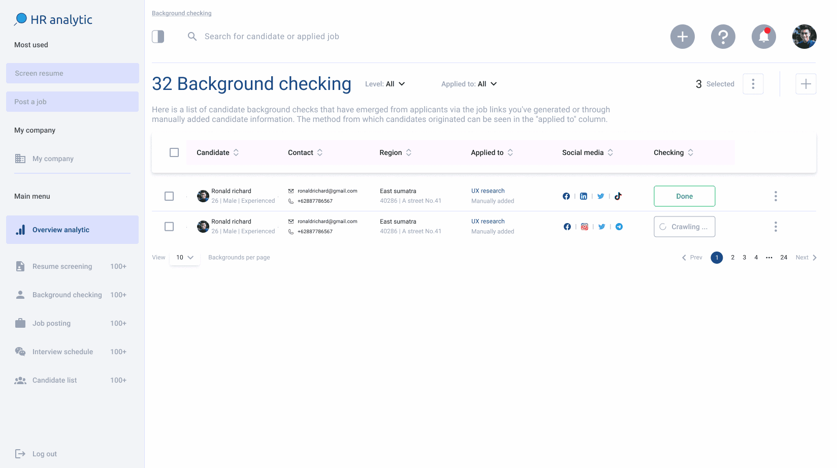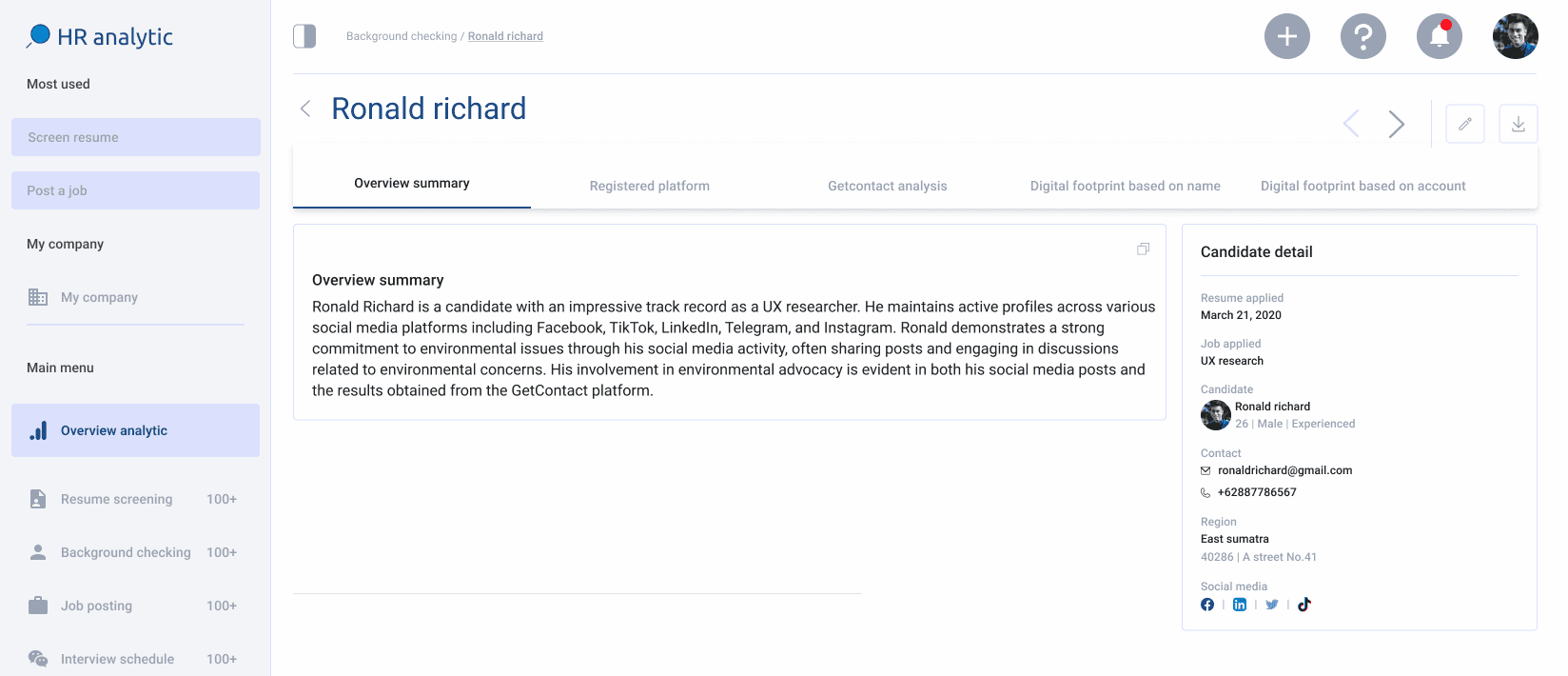 This is one of the main features, along with resume screening and job posting on the dashboard. Users can check the background and online activity of candidates, particularly on social media. When an applicant submits their resume via the landing page, their background is also verified if they have included their social media accounts in the resume.