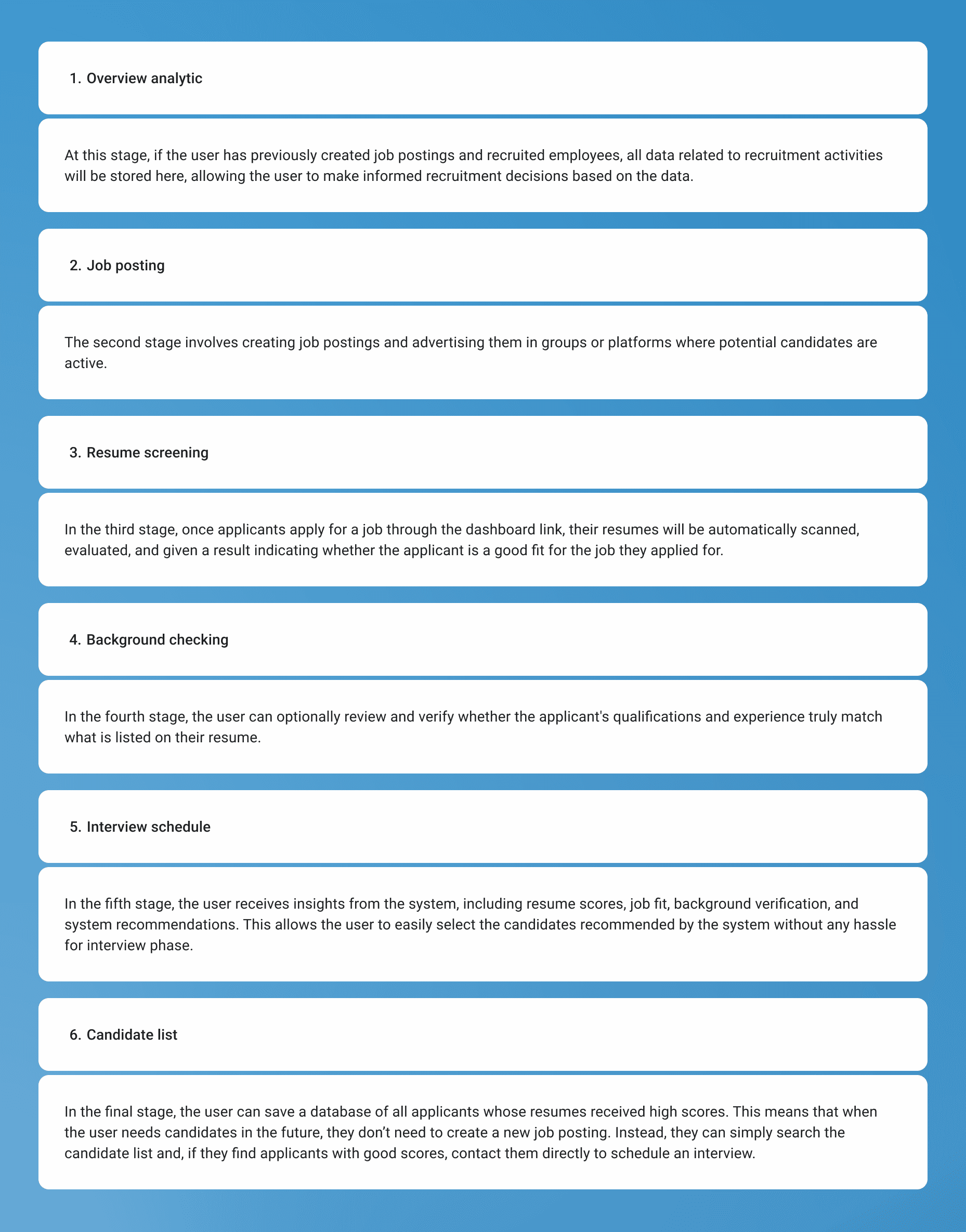 Based on the research I conducted, I will design the dashboard to align with the traditional recruitment process, incorporating features that are relevant to users' needs as identified by management, as well as new features that users require.